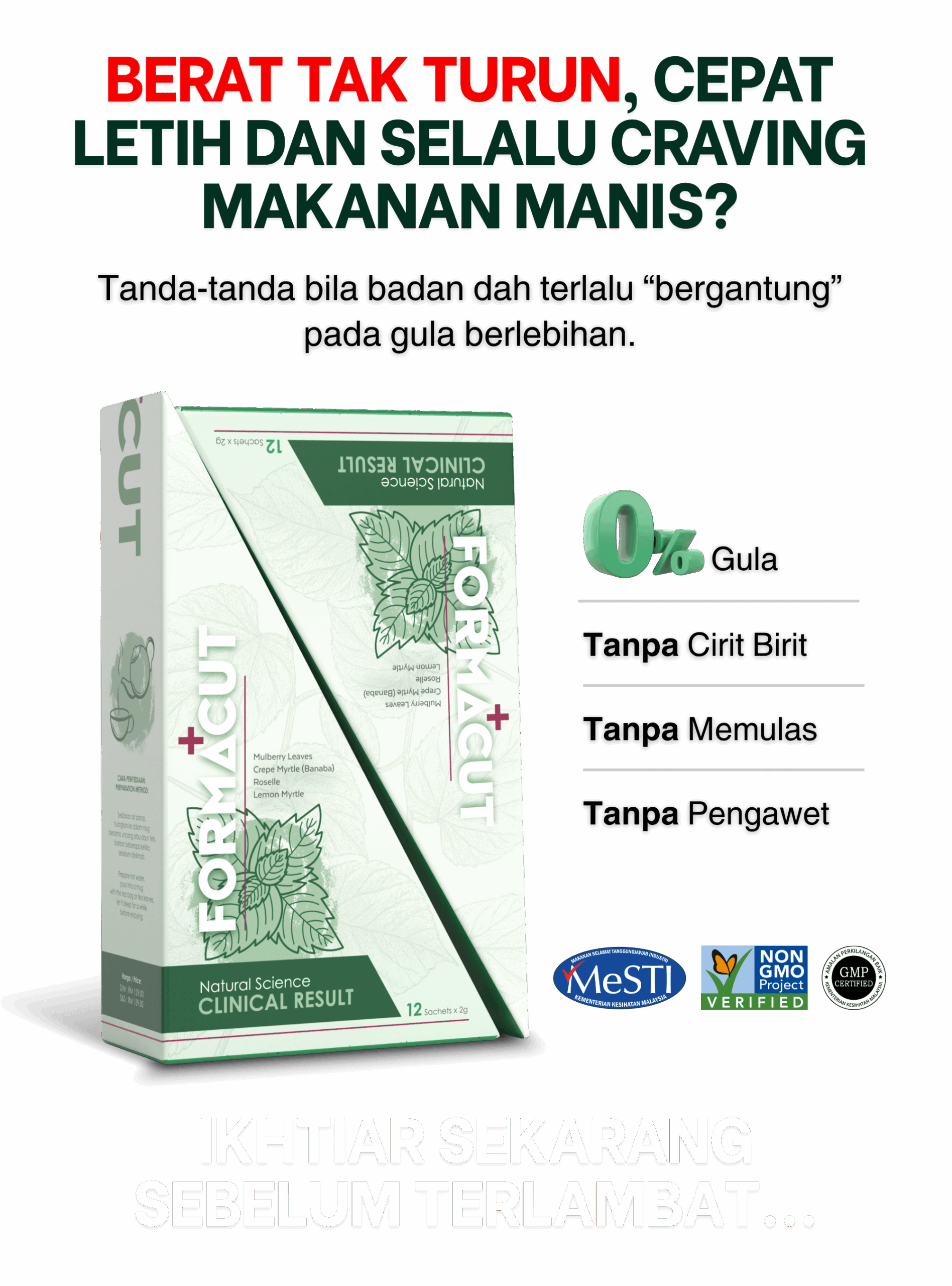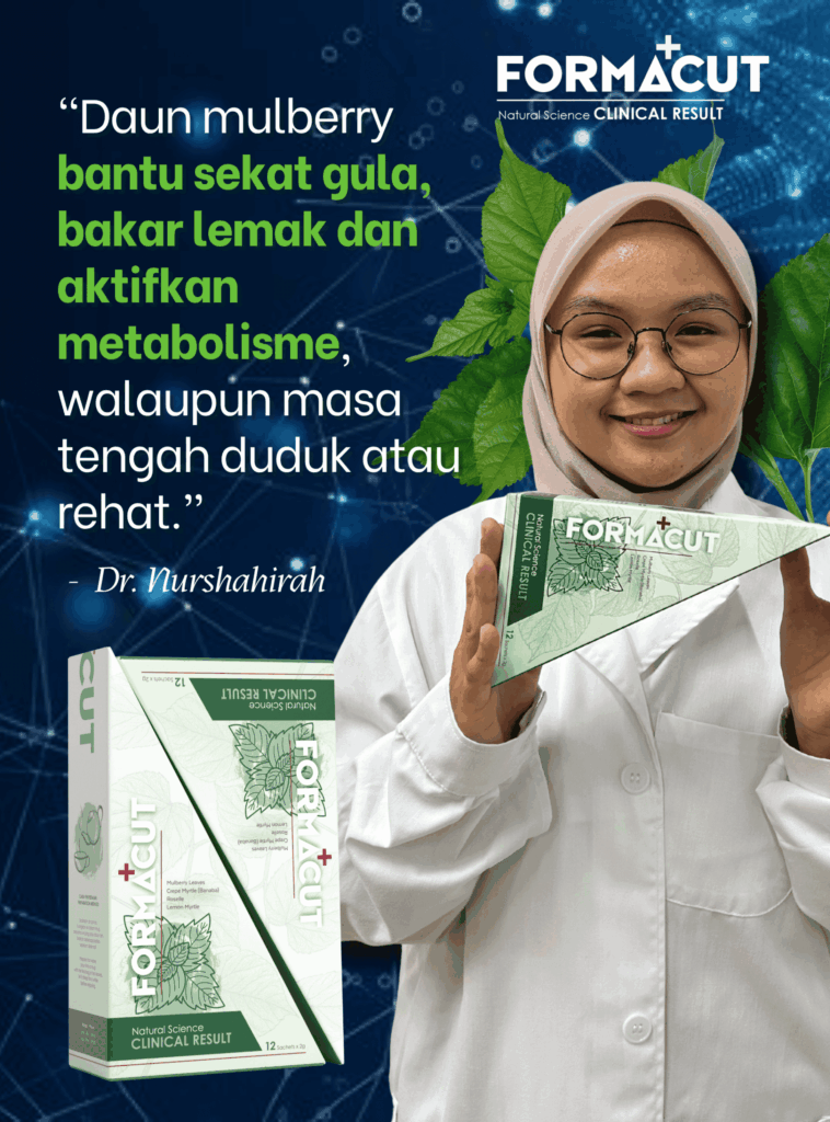 “Terbukti secara saintifik, Formacut dengan daun Mulberry bantu kawal gula darah, percepat metabolisme lemak, dan sokong penurunan berat badan secara semula jadi, selamat, dan efektif.” - Dr. Nurshahirah