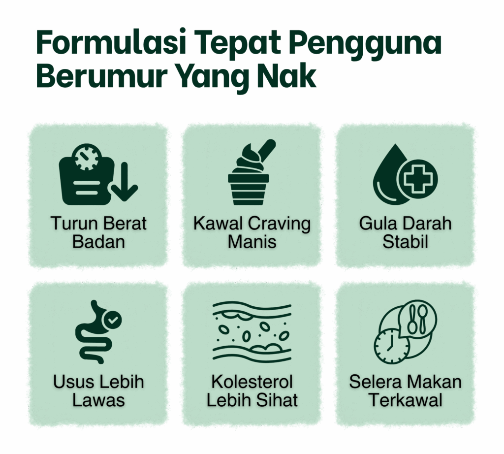 Dengan mekanisme unik ini, proses penurunan berat berlaku sehingga 17X Lebih Selamat, Berkesan dan bebas daripada kesan sampingan seperti cirit-birit.
