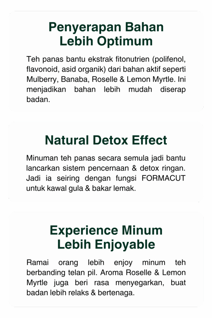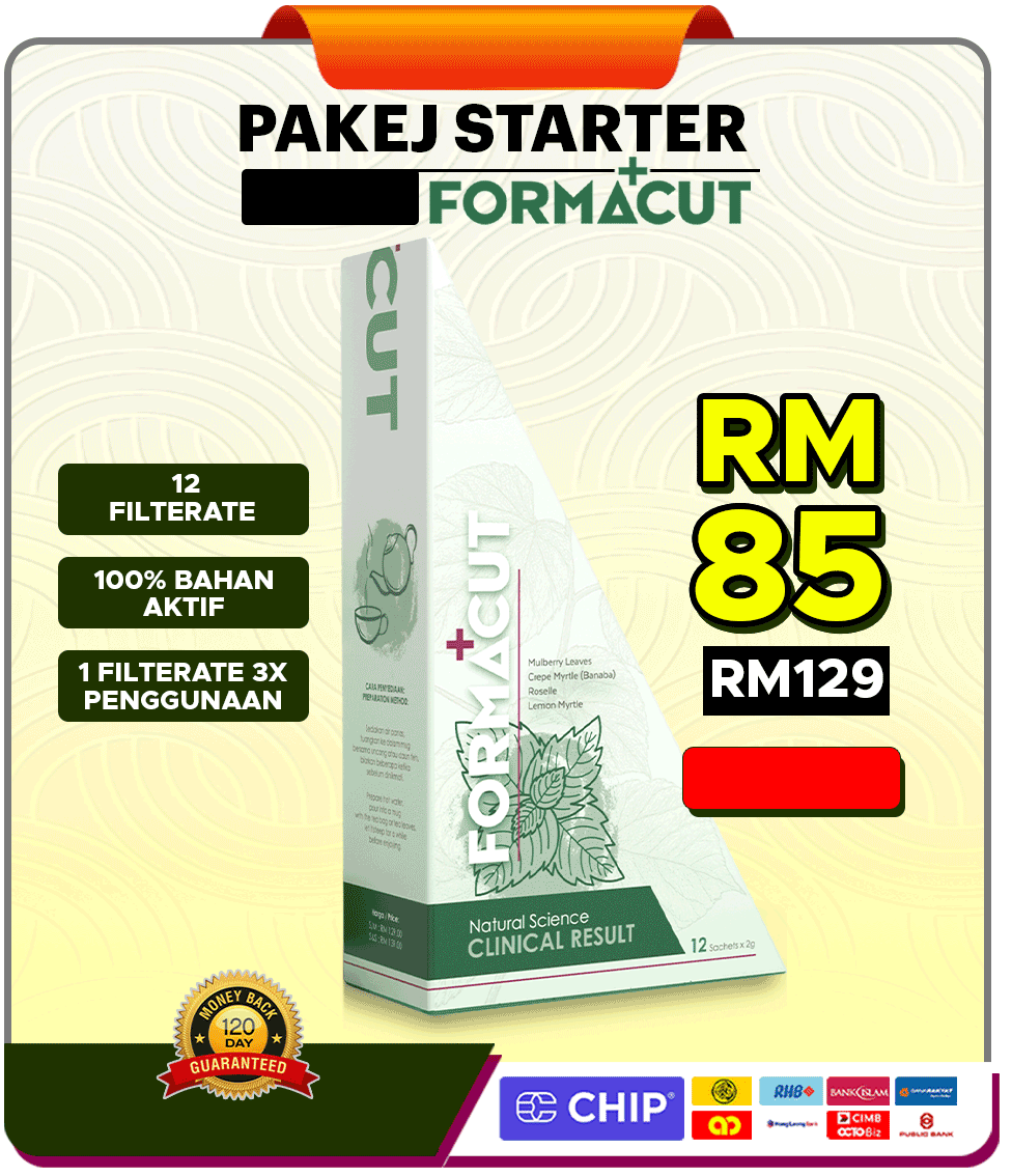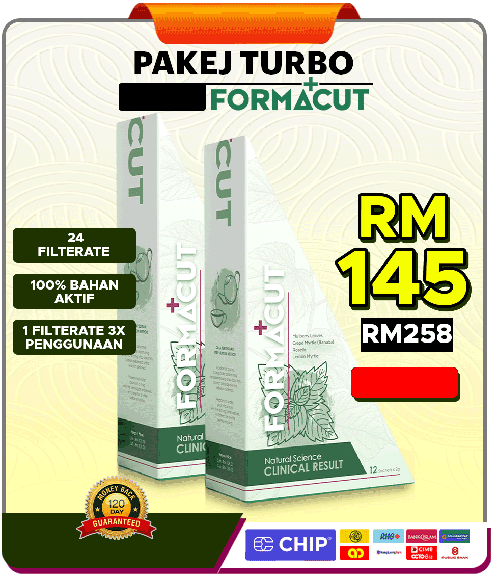 FORMACUT mengandungi Daun Mulberry berfungsi dengan block gula berlebihan daripada diserap dalam badan. Bila gula terkawal, proses pembakaran lemak jadi lebih pantas, selera makan lebih terkawal dan mengurangkan lebihan air terkumpul (gemuk air) dengan cara lancarkan pembuangan.
