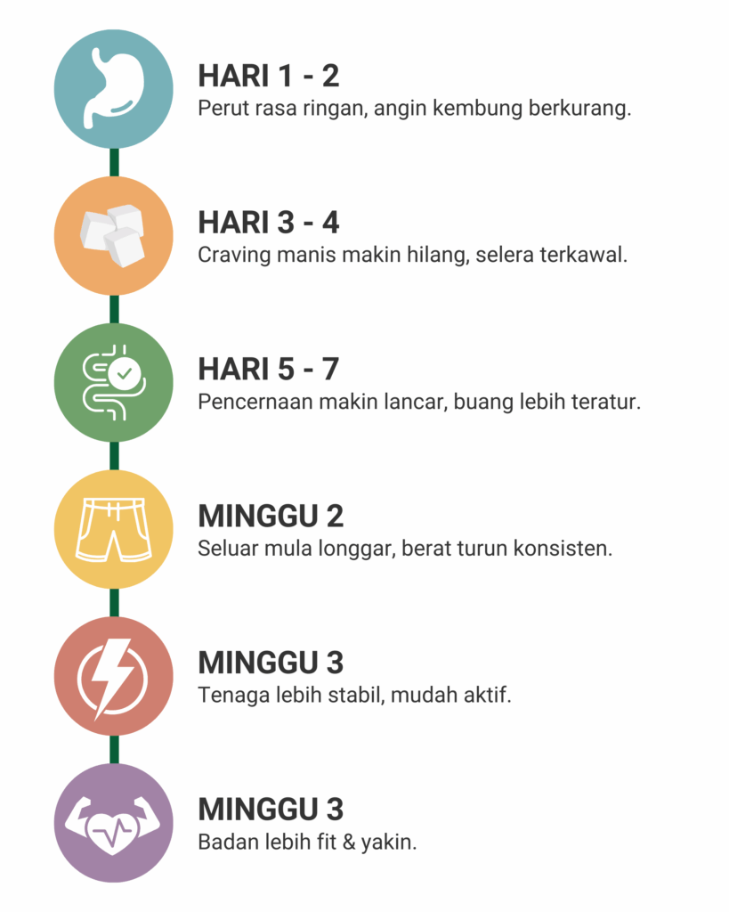 Pengguna rasa perut lebih ringan dan alami penurunan berat 2–5kg dalam 1–2 minggu.